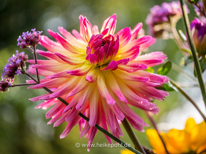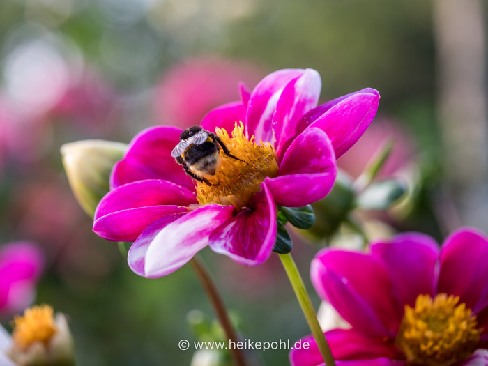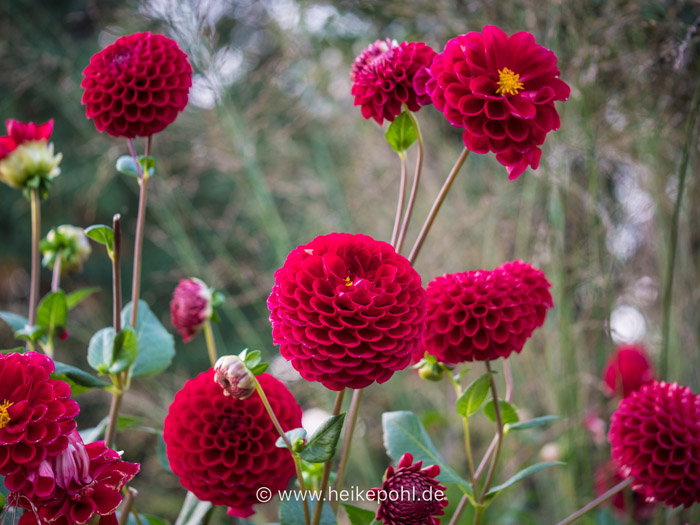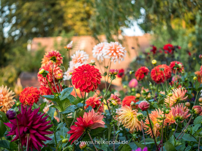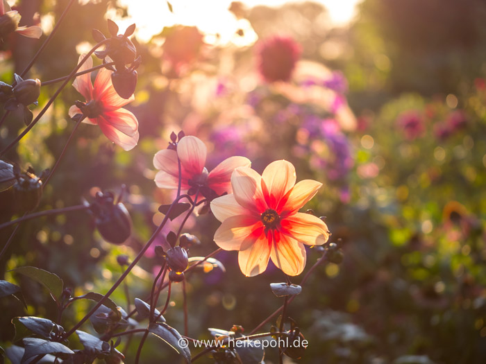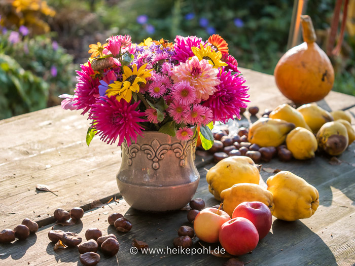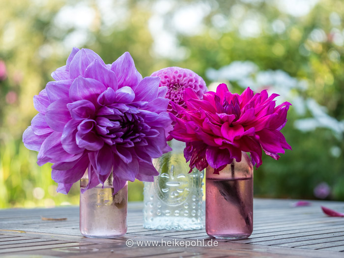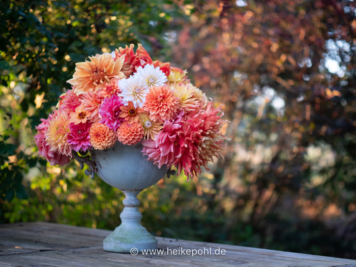 Bis November ist das Blütenmeer garantiert und es macht große Freude, die vielen schönen Blüten in Sträußen, Gestecken und Kränzen zu verarbeiten, sie zu fotografieren, den Insekten dabei zuzusehen, wie sie die Beete anfliegen oder einfach einzelne Schönheiten in schlichtes Glas zu stellen und mich an der Symmetrie und den Farben zu erfreuen. Bis … Ja, bis sich der Kreis schließt, der erste Frost das Laub dahinrafft und die Knollen wieder in den Hausflur wandern, wo sie auf den nächsten Mai warten und darauf, eingepflanzt zu werden.