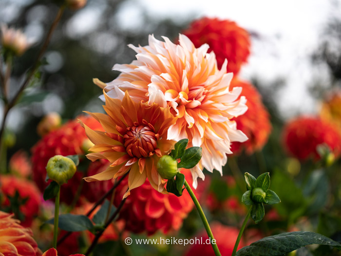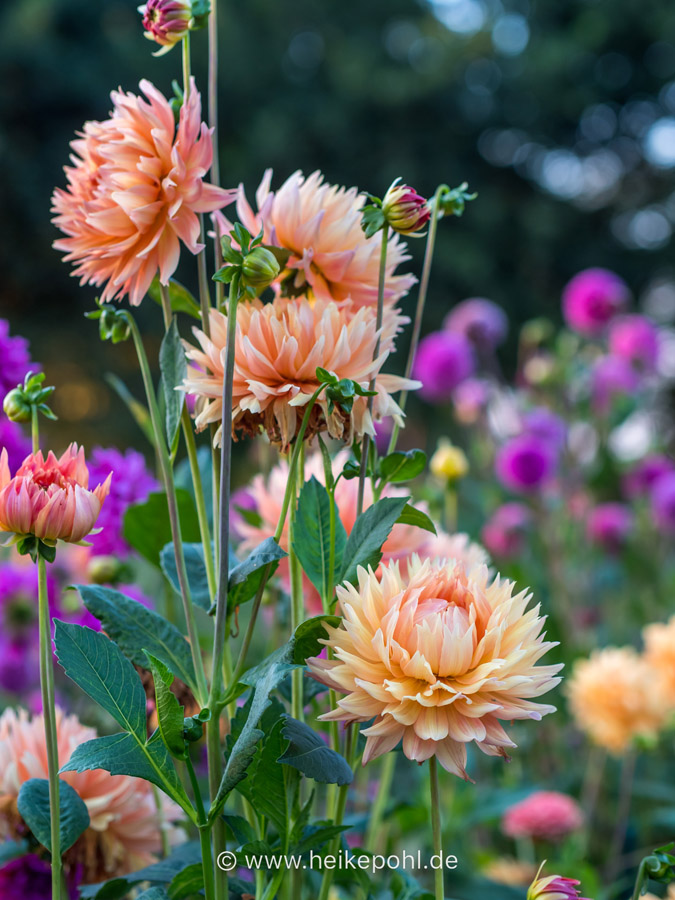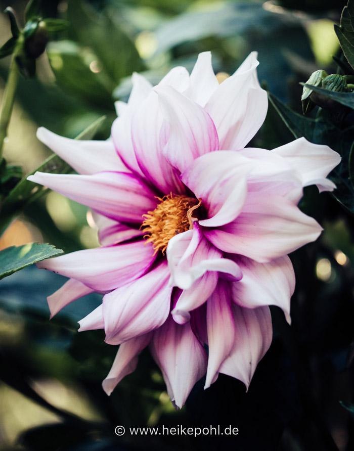 Es werden einfach so unglaublich viele Sorten in den schönsten Formen und Farben angeboten, dass ich regelrecht verführt werde. Die noch. Und – au ja – die ist auch schön – und – unbedingt – die Farbe noch, die muss ich auch haben. Womit wir bei den Farben wären. Ich habe eindeutig ein Faible für Orange und Violett bzw. gerade auch für diese Kombination, Lachs und Dunkelrot dürfen auch nicht fehlen, Pastelltöne finden sicher eher seltener und auch Gelb und Pink mag ich gerne. Aber die Dahlie besticht ja auch durch ihre vielen Formen und Größen der Blüten.