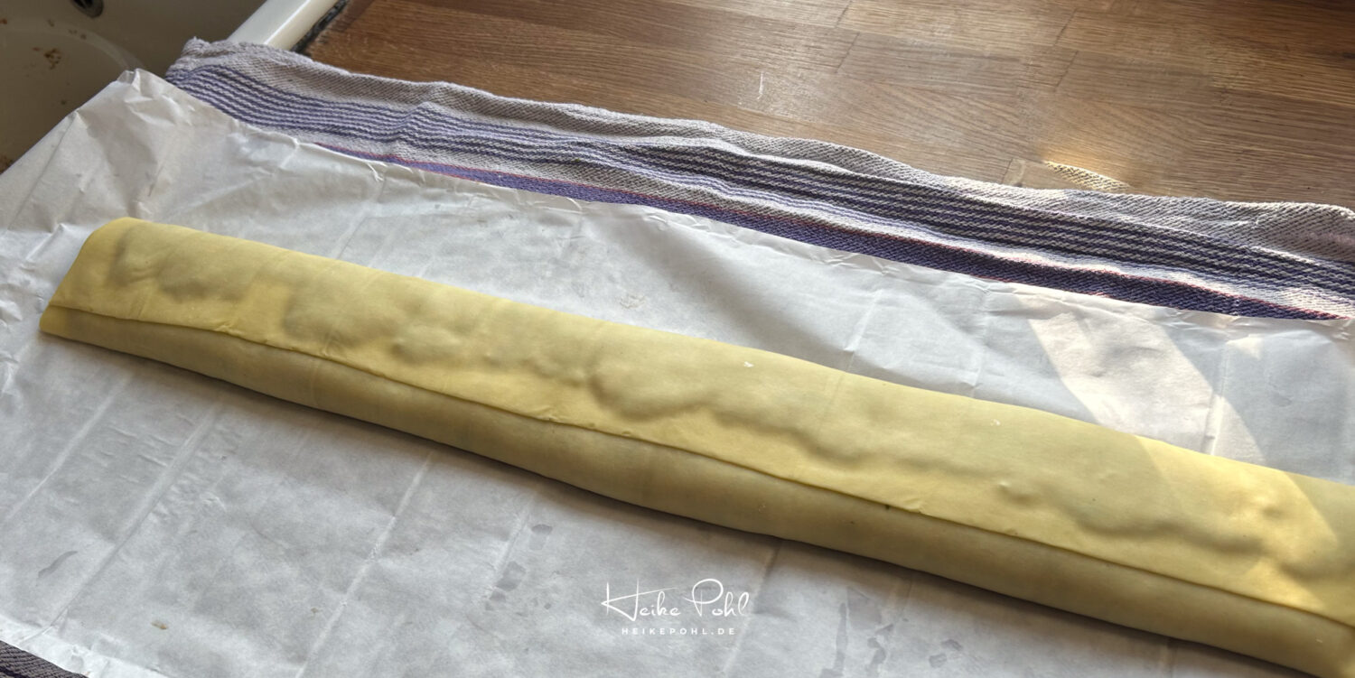 Die Arbeitsplatte mit einem größeren Geschirrtuch bedecken, und darauf den Teig auslegen oder (Bürger-Teig) ausrollen (Teig bitte auf dem Papier lassen).