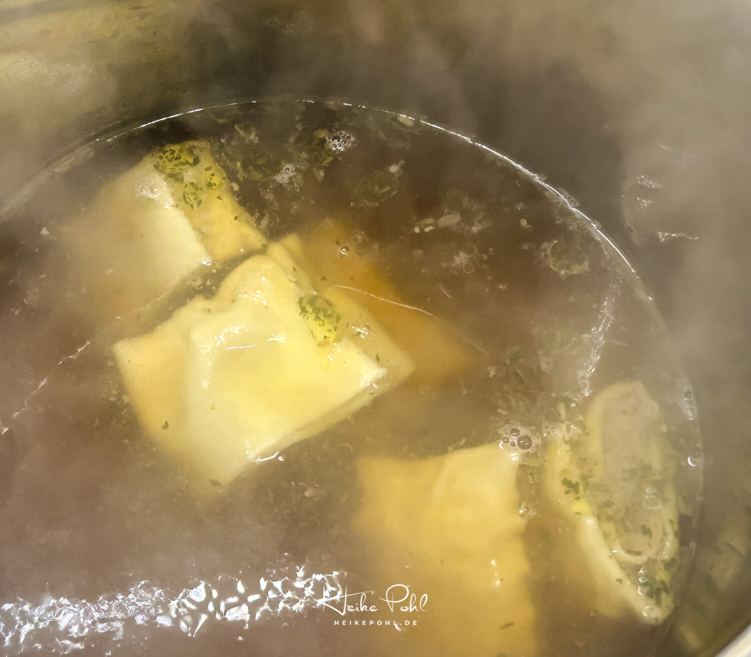Sowie die Brühe aufkocht, die Flamme kleiner stellen. Die Maultaschen sollen in der Brühe siedend ziehen und nicht zerkocht werden.