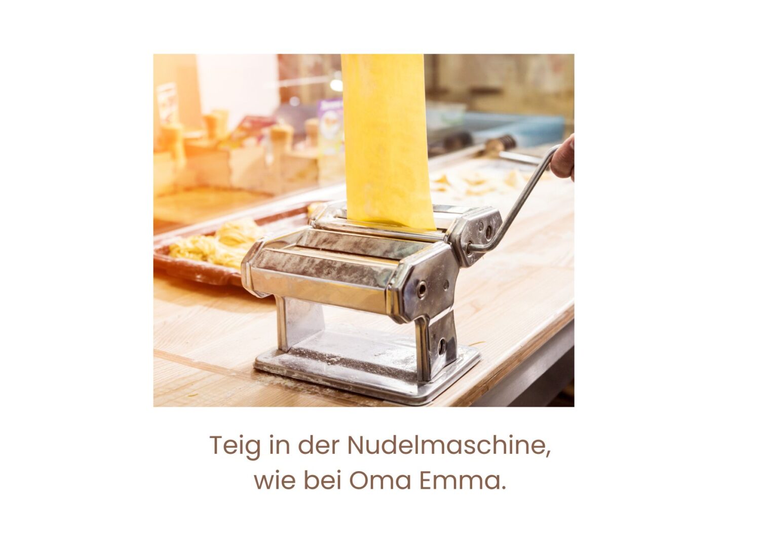 Während auf dem Ofen bereits eine kräftige Brühe vor sich hin dampfte, hat meine liebe Schwenninger Oma aus Mehl, Eiern, Wasser und Salz einen glatten, festen Teig gewalkt, den sie dann mit routinierten Handgriffen durch ihre Nudelmaschine schickte. Mit ihrer bemehlten Linken führte sie die glatten Bahnen durch die Walzen, mit ihrer Rechten drehte sie die Handkurbel und legte den Teig dann sachte in Wellen auf dem Küchentisch ab. Diese Prozedur wiederholte sie so lange, bis der Teig die gewünschte Stärke hatte. Er sollte dünn sein, aber stark genug, die Füllung zu halten und nicht zu reißen.