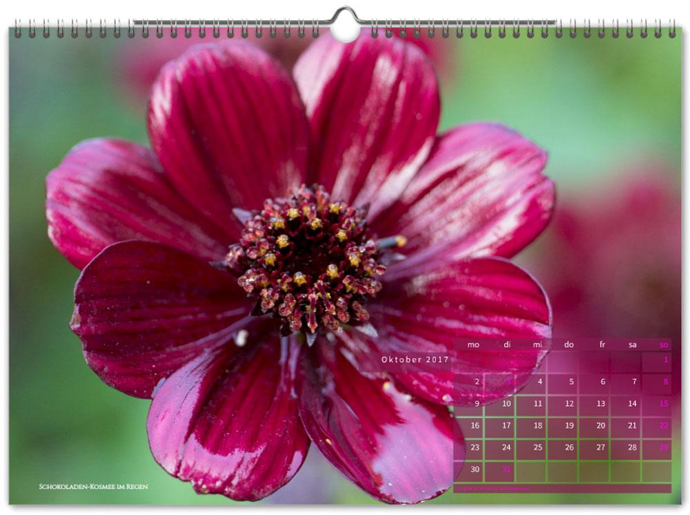 In meinen jährlichen Kalendern zeige ich das Landleben, meinen Garten, Natur und Tiere, Schleswig-Holstein und was mich umgibt von seiner schönsten Seite. Die Motive folgen dem Lauf der Jahreszeiten und sind eine bunte Mischung aus dem Leben im Norden Deutschlands. Mit der Vielfalt möchte ich möglichst viele Menschen mit unterschiedlichsten Interessen erreichen. Und ab und an und in manchen Jahren bringe ich dann auch mal einen speziellen Kalender heraus, wie zum Beispiel den mit Historischen Rosen.