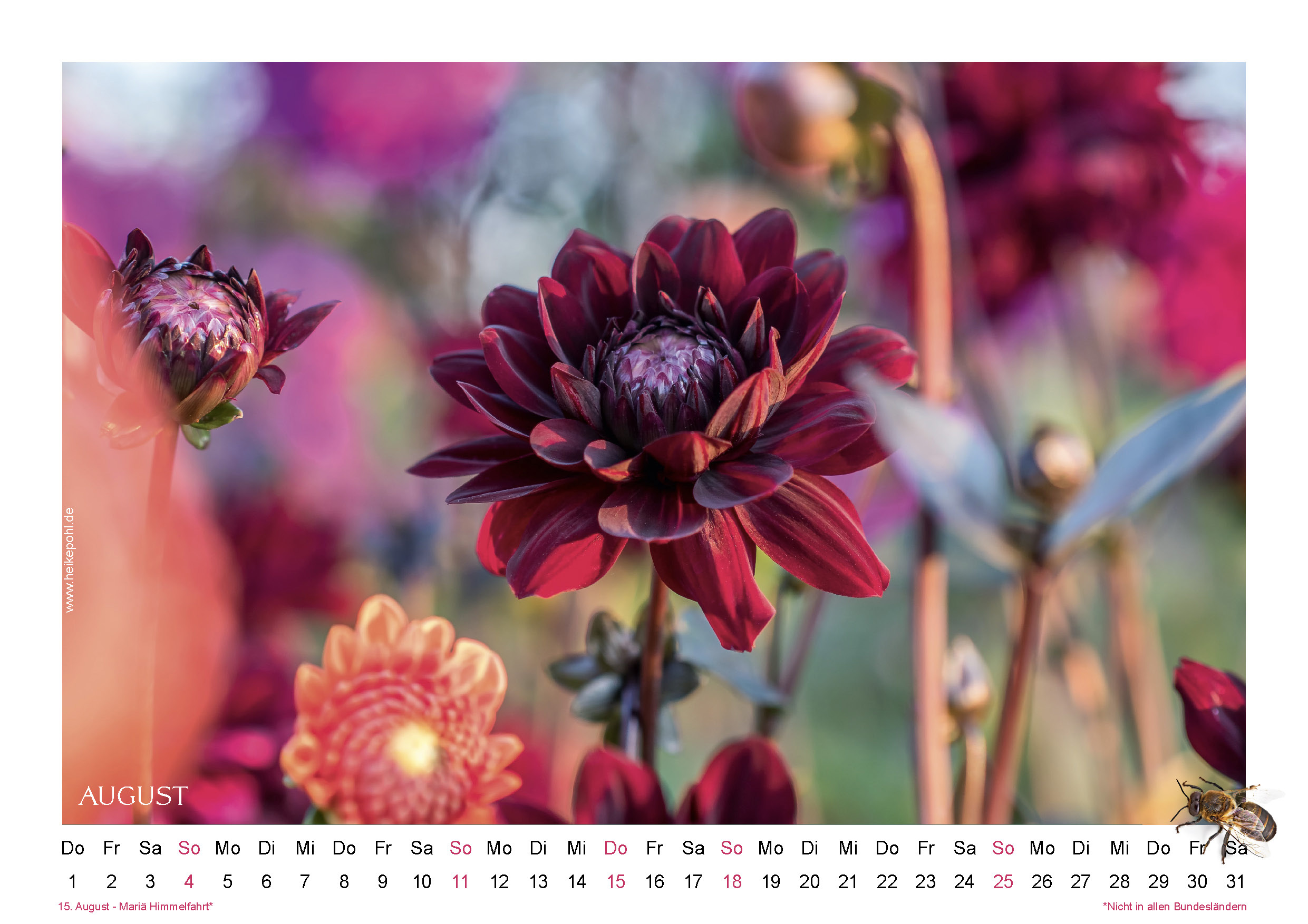 In meinen jährlichen Kalendern zeige ich das Landleben, meinen Garten, Natur und Tiere, Schleswig-Holstein und was mich umgibt von seiner schönsten Seite. Die Motive folgen dem Lauf der Jahreszeiten und sind eine bunte Mischung aus dem Leben im Norden Deutschlands. Mit der Vielfalt möchte ich möglichst viele Menschen mit unterschiedlichsten Interessen erreichen. Und ab und an und in manchen Jahren bringe ich dann auch mal einen speziellen Kalender heraus, wie zum Beispiel den mit Historischen Rosen.